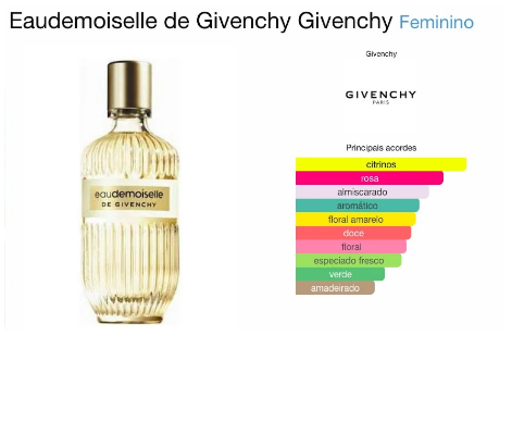Eaudemoiselle de Givenchy de Givenchy é um perfume Floral Feminino. Eaudemoiselle de Givenchy foi lançado em 2010. O perfumista que assina esta fragrância é Francois Demachy As notas de topo são Limão de Amalfi, Manjericão e Tangerina as notas de coração são Tintura de Rosa e Ylang Ylang as notas de fundo são Almíscar, Ambreta e Fava Tonka.